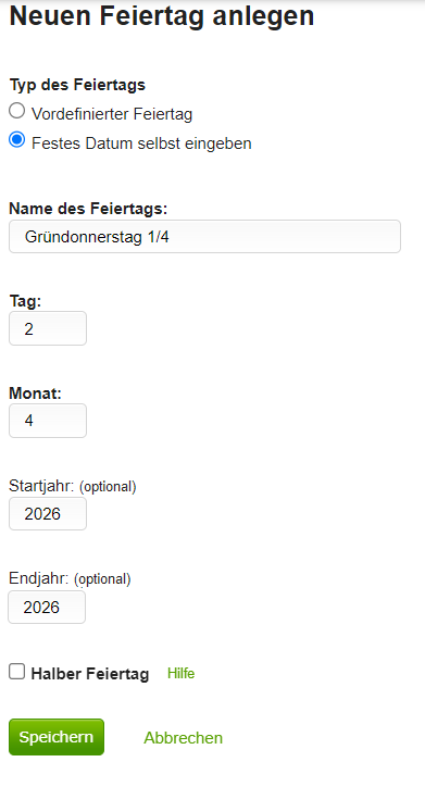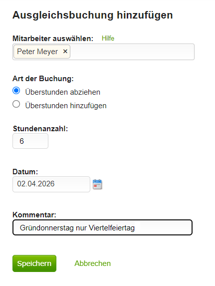 Um den Unterschied zwischen dem hinterlegten Feiertag und dem tatsächlichen Viertelfeiertag auszugleichen, muss der Administrator eine Ausgleichsbuchung durchführen.