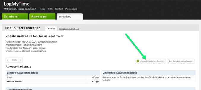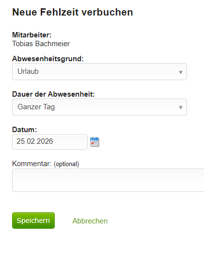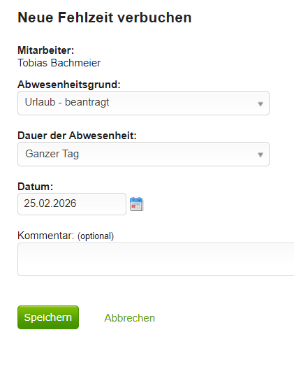 Verwaltung > Urlaub und Fehlzeiten > Knopf: Neue Fehlzeit verbuchen